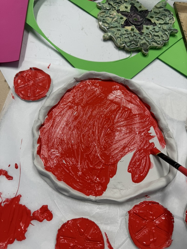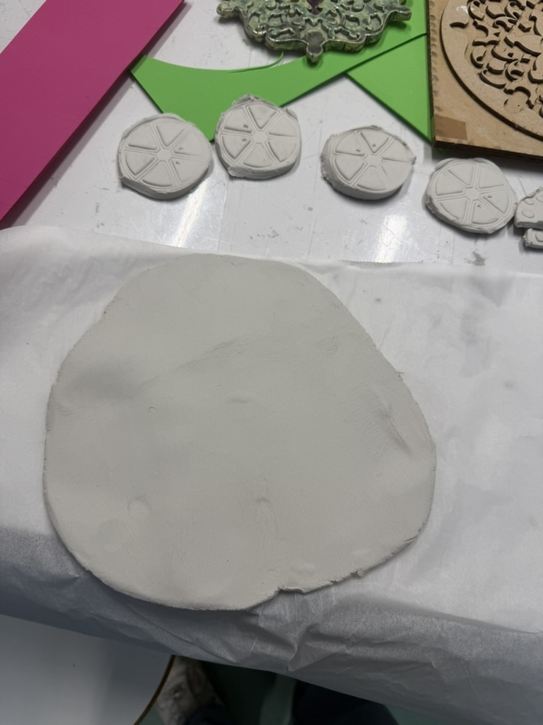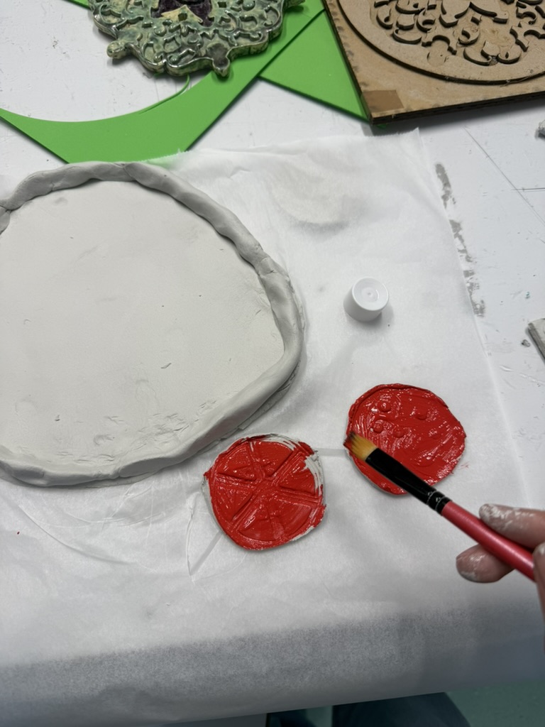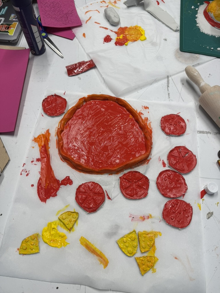 In de tussentijd heb ik de vormpjes op stukjes klei gedrukt om een patroon te maken. Hier ging wel wat fout, aangezien er geen gaten in de kaas of stukjes tomaat zaten in mijn ontwerp.