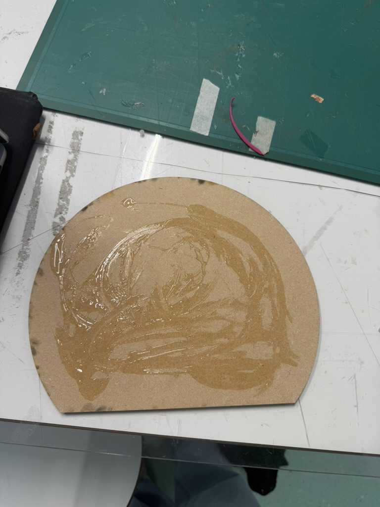 - Voordat ik deze kon lasersnijden, moest ik twee dingen doen: een houten plaat pakken en daar EVA-foam op doen. Dit heb ik met lijm gedaan.